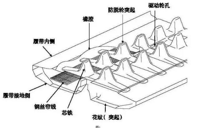 橡胶履带是一种在橡胶带中嵌中有一定数量的金属及钢丝帘线履带式行走部件,它具有如下优点: