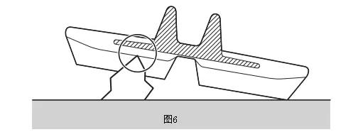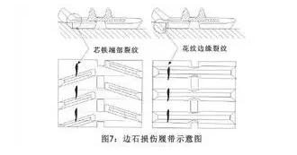 (4) 道路的边石、车辙或凹凸不平的路面会导致履带边缘接地侧花纹产生裂纹,这种裂纹未伤及钢丝帘线时可以继续使用。(图7)